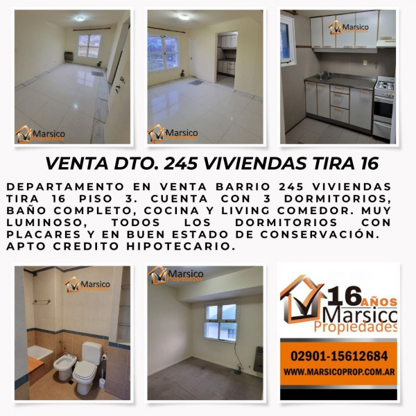 Departamento en venta con 3 dormitorios, baño completo, cocina y living comedor. Muy luminoso, todos los dormitorios con placares y en buen estado de conservación.