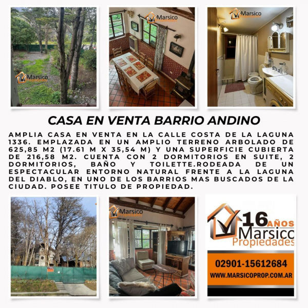 Amplia casa en venta en la calle Costa de la Laguna 1336. Emplazada en un amplio terreno arbolado de 625,85 m2 (17.61 m x 35,54 m) y una superficie cubierta de 216,58 m2. Cuenta con 2 dormitorios en suite, 2 dormitorios, baño y toilette.