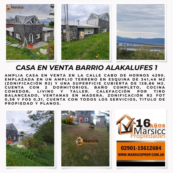 Amplia casa en venta en la calle Cabo de hornos 4290. Emplazada en un amplio terreno en esquina de 341,46 m2 (zonificación r2) y una superficie cubierta de 128,86 m2. cuenta con 2 dormitorios, baño completo, cocina comedor, living y taller. Calefacción por tiro balanceado, ventanas en madera. zonificación r2 FOT 0,38 y fos 0,31, cuenta con todos los servicios, titulo de propiedad y planos.