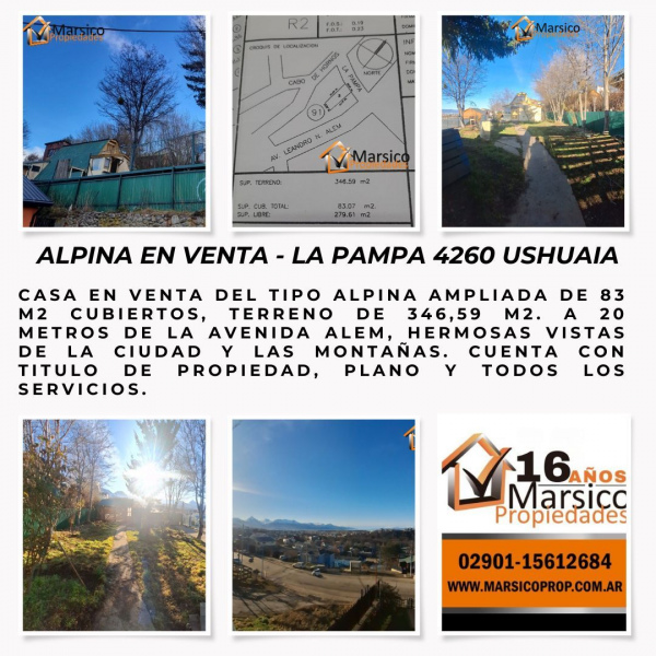 Casa en venta del tipo Alpina ampliada de 83 m2 cubiertos, terreno de 346,59 m2. A 20 metros de la avenida Alem, hermosas vistas de la ciudad y las montañas. Cuenta con titulo de propiedad, plano y todos los servicios.
