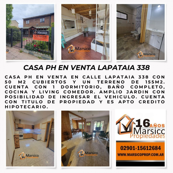 Casa ph en venta en calle Lapataia 338 con 50 m2 cubiertos y un terreno de 155m2. cuenta con 1 dormitorio, baño completo, cocina y living comedor. amplio jardín con posibilidad de ingresar el vehículo. Cuenta con titulo de propiedad y es apto crédito hipotecario.
